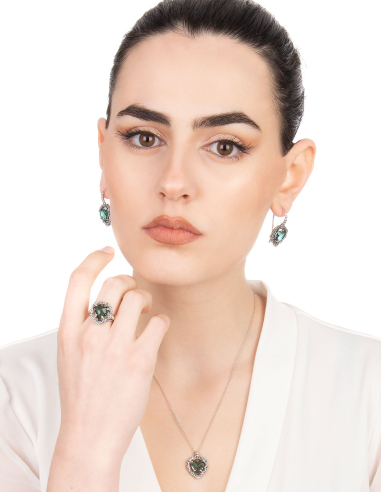 Nella coerenza delle forme e delle linee abbiamo abbinato un topazio semiprezioso di colore verde, accuratamente selezionato.