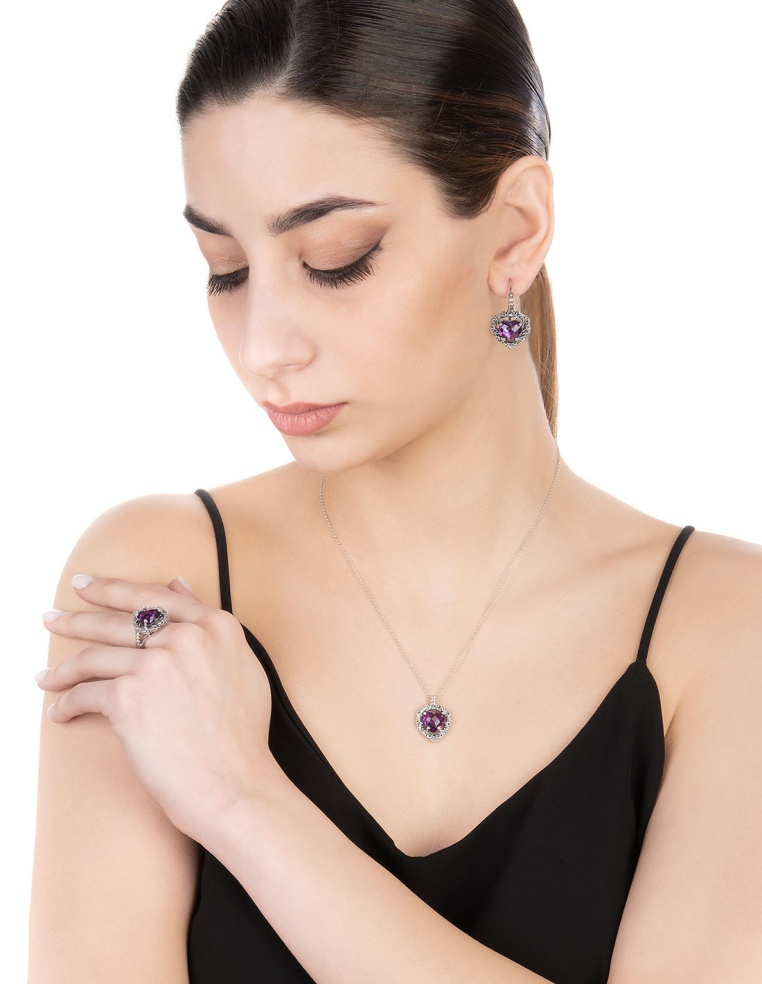 Nella coerenza delle forme e delle linee abbiamo abbinato un topazio semiprezioso di colore viola, accuratamente selezionato.