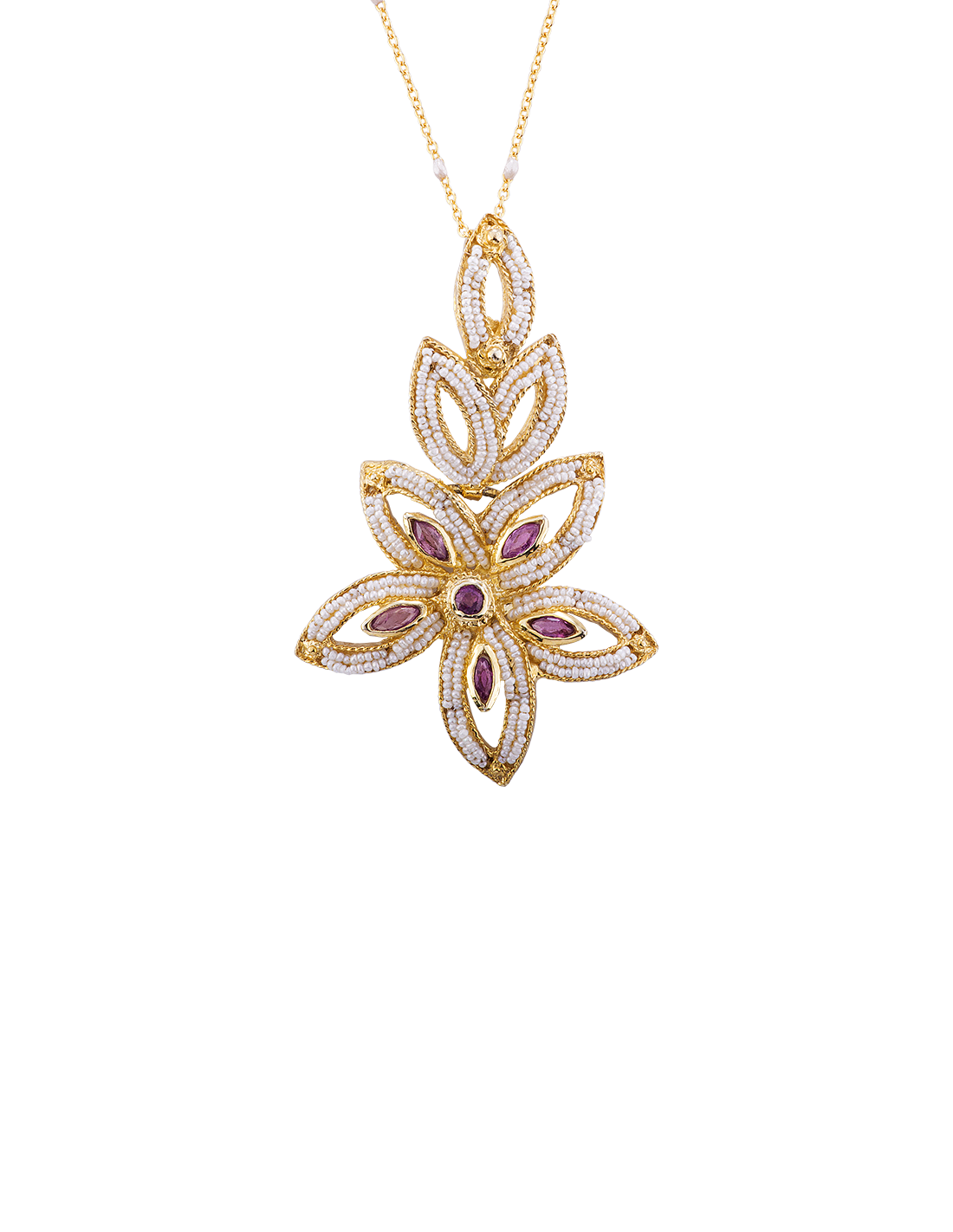 Oro, microperle autentiche cucite sul gioiello con filo d'oro, secondo la tradizione di famiglia e pietre.