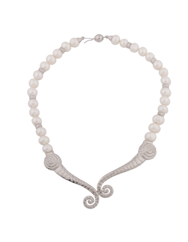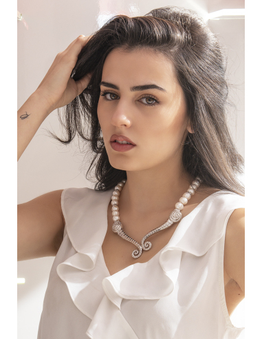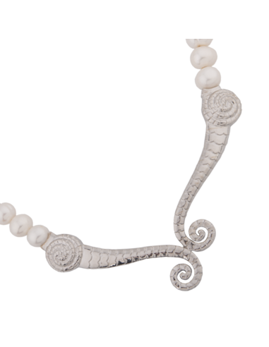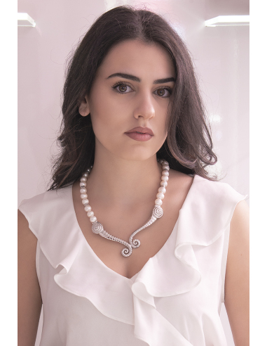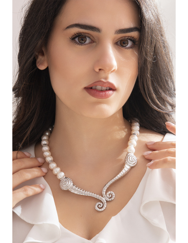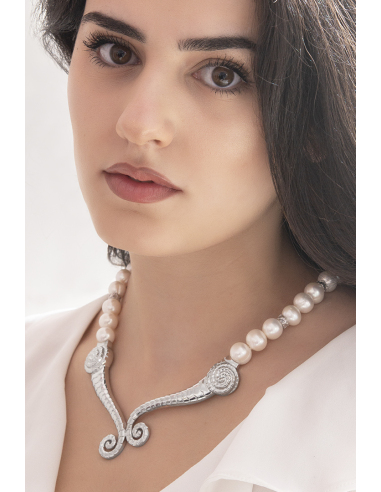 Elegantissimo collier con perle naturali di mm 12,5/13 intramezzate da rondelline con drago in argento 925/1000 e code del drago in argento 925/1000