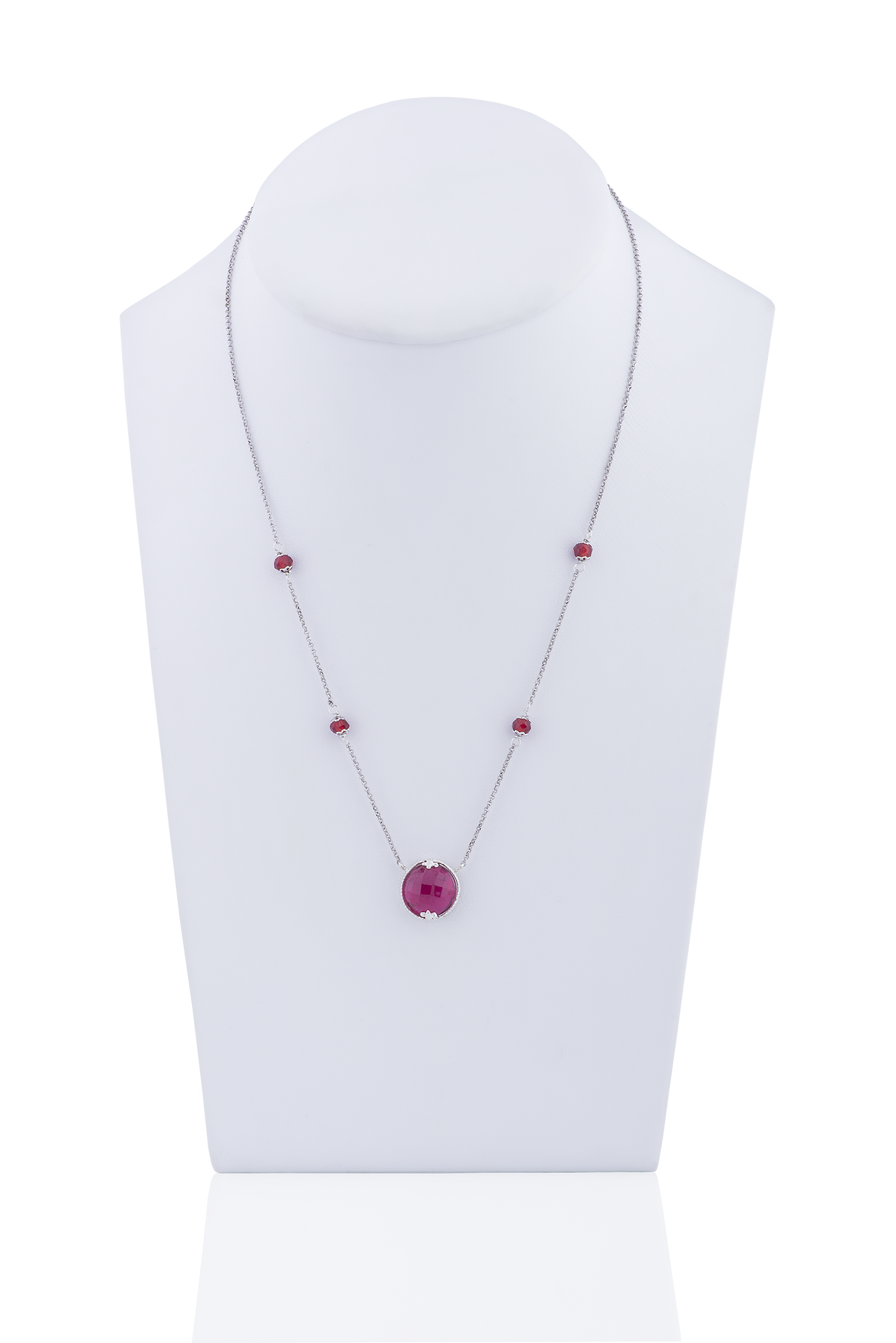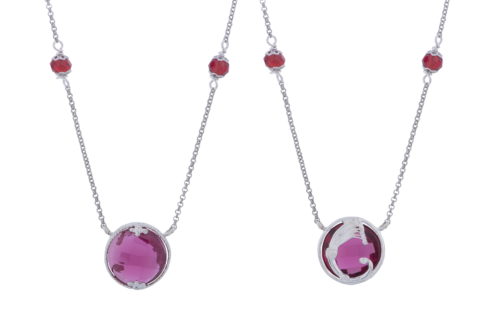 Collier Opplà girevole in argento 925/1000 con cristallo briolè sfaccettato rosso da un lato e drago dall’altro lato. Catena rolò con 2 cristalli tondi per lato.