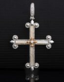 La croce Excalibur simbolo pieno di significato, legato alla cultura cristiana che simboleggia l'unione e la forza degli opposti in questa versione di alta gioielleria in oro bianco illuminato da radiosi diamanti.