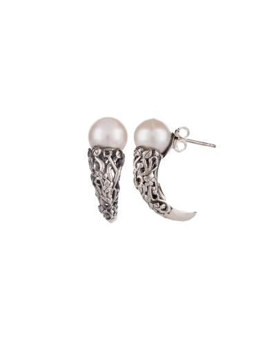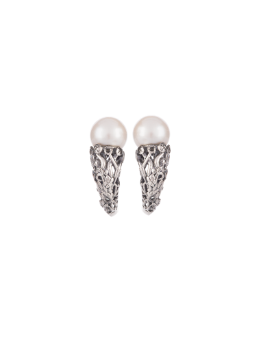 Gli orecchini propongono una lavorazione in argento ispirata ai dettagli della figura gioachimita dell'Albero della Vita con due perle a lobo.