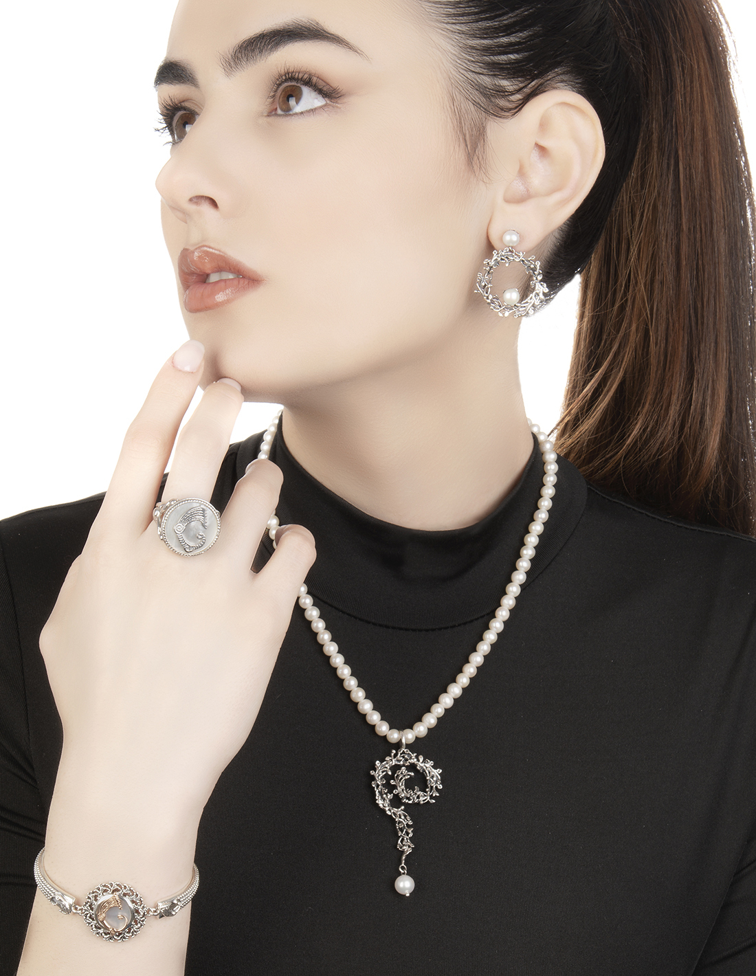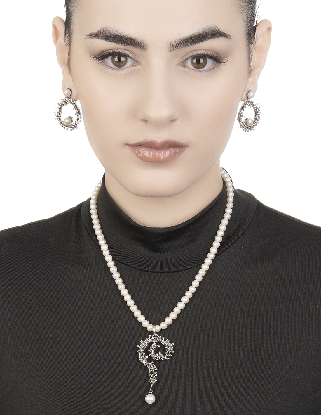 Nella coerenza delle forme e delle linee abbiamo abbinato perline naturali al centro e alla chiusura, accuratamente selezionate.