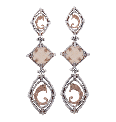 Orecchini in argento 925/1000 con rombetto al lobo con drago rose' dentro, occhio di tigre di colore verde con griffe giglio e rombo piu' grande con drago rose' sotto.